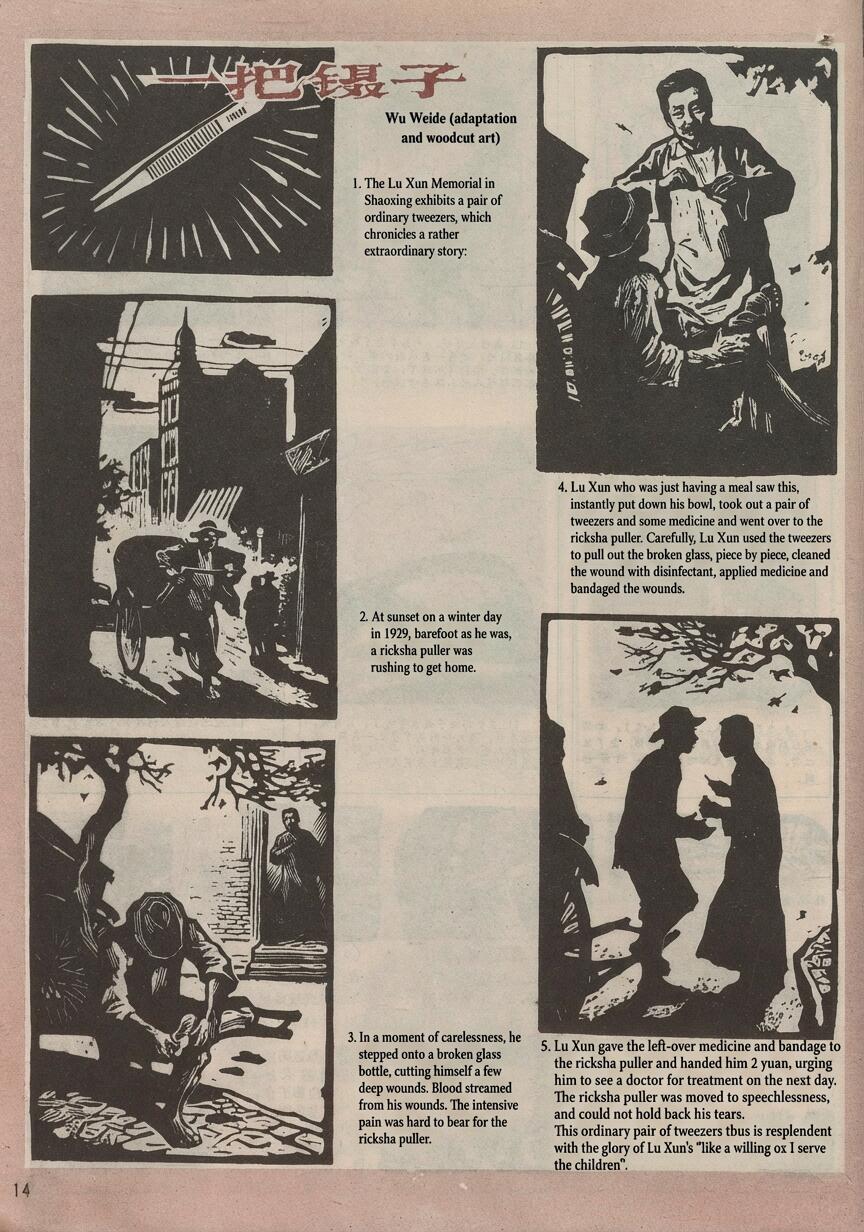 Lu Xun who was just having a meal saw this, instantly put down his bowl, took out a pair of tweezers and some medicine and went over to the ricksha puller. Carefully, Lu Xun used the tweezers to pull out the broken glass, piece by piece, cleaned the wound with disinfectant, applied medicine and bandaged the wounds.
